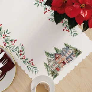 Świąteczny bieżnik z wodoodpornej tkaniny w rozmiarze 60 × 120 cm to idealna dekoracja stołu na święta, łącząca elegancję z funkcjonalnością. Wykonany z biał...