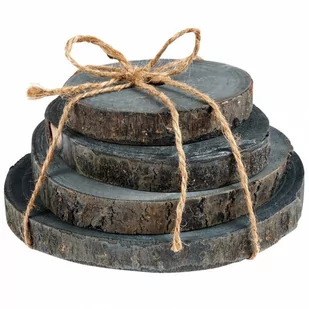 PRAKTYCZNE - Zestaw czterech dekoracyjnych plastrów drewna wraz z korą w grafitowym kolorze. Każdy z plastrów ma inną średnicę: 12 cm, 16 cm, 19 cm, 21,5 cm. Grubość podkładek wynosi 2 cm. DREWNIANE - Wykonane z najwyższej jakości drewna paulownia, które cechuje się lekkością i naturalnymi barwami.