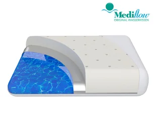 Mediflow – oryginalna poduszka wodna z pianką żelową Visco Mediflow – oryginalna poduszka wodna z pianką żelową Visco Udowodniono, że oryginalny system poduszki wodnej Mediflow poprawia jakość snu i może znacznie zmniejszyć ból szyi. Dowodem na to są opublikowane badania kliniczne prowadzone przez renomowany amerykański uniwersytet Johns Hopkins. Szczególną cechą poduszki jest rdzeń wodny, znajdujący się na spodzie poduszki. Poduszka wypełniona wodą dopasowuje się do obszaru głowy i szyi przy każdym ruchu. Wnęki w poduszce wynikające ze zmiany pozycji snu są natychmiast wypełniane wodą.