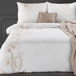 EUROFIRANY POŚCIEL HAFTOWANA (2) SATYNOWA BIAŁA + ZŁOTA 160X200 Komplet pościeli w rozmiarze 160x200 cm z miękkiej satyny bawełnianej, zdobionej haftowanymi liśćmi miłorzębu w kontrastowym kolorze to idealne dopełnienie eleganckiej sypialni. Pościel satynowa marki Eurofirany została wykonana z tkaniny wysokiej jakości (gramatura 125g/m2), która charakteryzuje się znakomitą jakością przędz. Powierzchnia pościeli jest jednorodna i łatwa w prasowaniu. Materiał pościeli jest subtelny - miły i miękki w dotyku. Delikatny połysk nadaje pościeli elegancji.