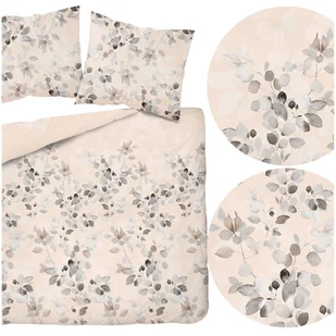 Komplet pościeli bawełnianej o satynowym splocie z poszewką na kołdrę 220 x 200 cm i 2 poszewkami na poduszki w kolorze beżowym z wzorem liści to modny dodatek do sypialni. Miękka i przyjemna tkanina zachowuje swój rozmiar nawet po wielu praniach. Poszewki zapinane są na wygodny zamek błyskawiczny.