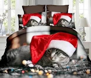 Piękna świąteczna pościel z motywem świątecznego kota na grafitowym tle. Druga strona jest gładka szara Pościel 3D wykonana jest w 100% z wysokiej jakości mi...