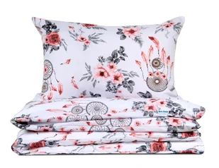 BELLA STORIA POŚCIEL BAWEŁNIANA 140X200 ŁAPACZE SNÓW I KWIATY Z TORBĄ Pościel bawełniana Łapacze snów i kwiaty w rozmiarze 140x200 cm z jedną poszewką 70x80 cm to idealna propozycja dla każdego, kto lubi sielskie, romantyczne i delikatne wnętrza. Utrzymana jest w delikatnych kolorach, ze wzorem w szare łapacze snów i różowe kwiaty na białym tle. Doskonale sprawdzi się w pokoju nastolatki, małej dziewczynki czy sypialni dorosłych - w każdym pomieszczeniu doda lekkości i przytulności. IDEALNA NA PREZENT Wiemy, jak ważna jest ekologia. Przywiązujemy do ochrony środowiska szczególną wagę.