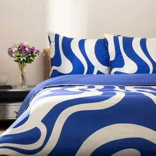 Oryginalny, granatowo-biały wzór Dekoracyjna żółta lamówka wokół pościeli Pościel granatowa w linie z żółtą lamówką Miękka i przyjemna w dotyku pościel z mik...