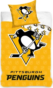 Pościel - Liga: NHL • Drużyna sportowa: Pittsburgh Penguins • Materiał: 100% bawełna • Kolor: Żółty - Czarny • Wymiary: 135×200/80×80 cm • System mocowania: zip