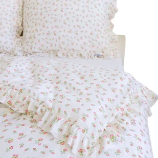 Pościel Muślinowa Z Falbanką Komplet Zestaw 200X200 Cm Czerwone Kwiatki + 2 Poduszki 70X80 Cm
