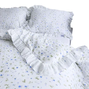 Pościel Muślinowa Z Falbanką Komplet Zestaw 200X200 Cm Niebieskie Kwiatki + 2 Poduszki 70X80 Cm