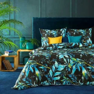 Pościel satynowa 160x200 czarna turkusowa liście Nika