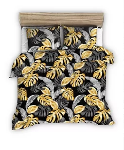 Zachowuje trwałość i świeżość przez długi czas. Prezentowany komplet zachwyca niezwykle popularnym wzorem egzotycznych liści na czarnym tle. Całość zwraca uwagę, nadając niepowtarzalny charakter każdemu wnętrzu. Poszwa na kołdrę i poszewki na poduszki zapinane są na praktyczny ekspres. W skład zestawu wchodzą: