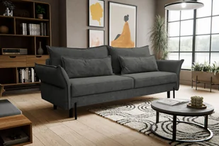 Wygodna sofa VOLIO z funkcją spania i pojemnikiem na pościelKanapa Volio przyciąga wzrok swym kształtem i z powodzeniem trafi w gusta bardzo szerokiego grona odbiorców. Omawiany model został zbudowany na bazie drewnianego stelaża, który w połączeniu z płytą meblową tworzy konstrukcję wytrzymałą, stabilną i o odpowiedniej sztywności. Bryła z zewnątrz zwraca uwagę dużymi zdejmowanymi poduszkami oparciowymi. Siedzisko sofy skonstruowane zostało z wysoko elastycznej pianki tapicerskiej oraz sprężyn falistych. Kanapa Volio jest tapicerowana z każdej strony, również z tyłu, co czyni ją meblem wolnostojącym, czyli takim, który bez problemu możemy odsunąć od ściany i ustawić w centrum pomieszczenia.