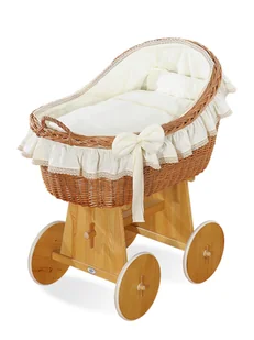 Piękny ręcznie pleciony wiklinowy kosz z lekko uniesionym tyłem tworzącym przytulne gniazdko. Polska naturalna zdrowa ekologiczna wiklina, 100% handmade, polski naturalny produkt. Naturalny kolor wikliny i drewna. W komplecie obszycie i pościel z kremowej bawełny z kremową haftowaną koronką.