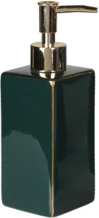 Stabilny ceramiczny pojemnik prezentuje się pięknie zarówno na klasycznej umywalce, jak i blacie z drewna lub kamienia. Kolor głębokiej zieleni ze złotymi elementami wpisuje się w najnowsze trendy wnętrzarskie. Akcesorium jest chętnie wybierane przez osoby, które preferują styl eklektyczny i city jungle. Z racji zastosowanych materiałów dozownik do mydła Eryn zielony jest odporny na wilgoć, zarysowania oraz działanie detergentów. Poręczna pompka aplikuje odpowiednią ilość kosmetyku.