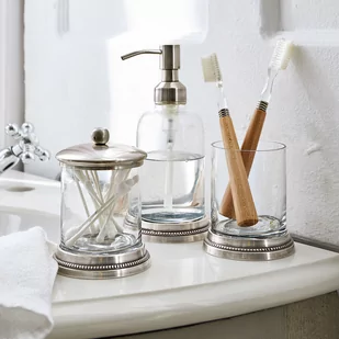 Szlachetne połączenie szkła i mosiądzu. Z ozdobną obwódką. Ponadczasowa elegancja. Ten stylowy i nieco nostalgiczny zestaw będzie ozdobą Twojej łazienki. Piękny dozownik urzeka zarówno wyglądem, jak i wysoką funkcjonalnością.