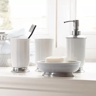 Wysokiej jakości zestaw wykonany z mosiądzu i ceramiki. Zestaw zawiera dozownik na mydło, miskę i dwa kubki. Połączenie jasnej ceramiki z delikatnym połyskiem mosiądzu tworzy szczególnie elegancki, ciepły efekt. Dozownik na mydło ma przyjemny w dotyku mechanizm dozujący – w końcu nie chodzi tylko o wygląd, ale również o wrażenia zmysłowe. Zestaw jest uniwersalny – do kubków można na przykład włożyć szczoteczki do zębów lub waciki.