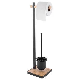 Stojak wc ze szczotką toaletową i uchwytem na papier 2w1 Stojak do WC 2w1 ze szczotką toaletową oraz uchwytem na papier toaletowy. Stojak w kolorze czarnym wykonany ze stali malowanej proszkowo z elementami naturalnego drewna bambusowego. Szczotka posiada plastikowy pojemnik chroniący przed rdzewieniem i ułatwiający czyszczenie. Szeroka podstawa i podkładki z tworzywa sztucznego zapewniają doskonałą stabilność. Najważniejsze cechy ✔ Stabilny stelaż ✔ Elegancki, czarny kolor ✔ Bambusowe elementy ✔ 2 produkty w 1 – oszczędność miejsca ✔ Wysoka jakość wykonania ✔ Włosie szczotki w kolorze czarnym Specyfikacja Marka: