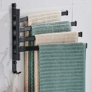 【Obrotowy wieszak na ręczniki o 180°】Nie wymaga wiercenia otworów, ten wieszak na ręczniki obraca się o 180° i jest wyposażony w składane ramiona i haki. Można go złożyć przy ścianie, gdy nie jest używany. Oszczędza miejsce i oddziela mokre od suchych ręczników.