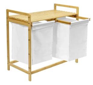 Funkcjonalny - posiada dodatkową półkę, która może służyć jako miejsce na akcesoria łazienkowe, środki piorące, a także jako miejsce na dekoracje czy świece zapachowe. Estetyczny - wykonany z szlifowanego bambusa, starannie wykończony. Bezpieczny - nie ma ostrych krawędzi. Łatwy w użytkowaniu - posiada szyny ułatwiające napełnianie i opróżnianie worka, który można łatwo zdjąć i wyprać. Szybki montaż - nie wymaga wiercenia ani specjalistycznych narzędzi.