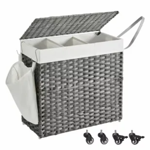 Pojemny kosz na pranie z 3 materiałowymi workami o łącznej pojemności 140 L , które po zdemontowaniu uchwytów można prać w pralce pomoże w organizacji i planowania prania. Kosz jest wykonany z wodoodpornego plecionego plastiku rattanowego PP, który gwarantuje długotrwałe użytkowanie, a 4 kółka z których 2 posiadają hamulce, ułatwiają blokowanie lub przemieszczenie kosza bez wysiłku. Dodatkowo, z boku znajduje się kieszeń na bieliznę, zapewniając dodatkową funkcjonalność, a solidna metalowa rama gwarantuje stabilność i wytrzymałość przez wiele lat użytkowania. Stylowy pomocnik jest praktycznym i trwałym rozwiązaniem dla sortowania i codziennego zarządzania praniem, który idealnie sprawdzi się w każdej łazience lub pralni. Wymiary: