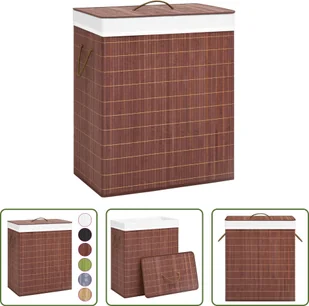 Kolor: brązowyMateriał: bambus, tkaninaWymiary: 52 x 32 x 62,5 cm (szer. x gł. x wys.)Kształt: ProstokątnyPojemność: 100 litrówZ wyjmowaną torbą wewnętrzną wykonaną z tkaninyUchwyt na pokrywieZ uchwytami po obu stronachZ 2 przegrodamiWszechstronna opcja przechowywaniaLekki i łatwy do przenoszeniaSkładany dla łatwego przechowywaniaDuża pojemność do organizowania i przechowywania ubrańUwaga: