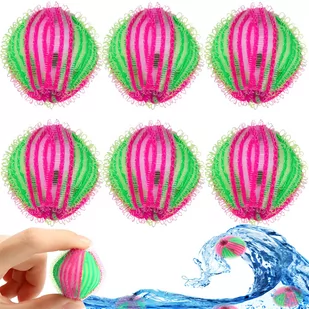 Po wyczyszczeniu wystarczy usunąć kłaczki i włosy z kulek i użyć ich ponownie. ZALETY Nadają się do stosowania w pralce Skuteczne na objawy filcowania się powierzchni i tworzeniu się pęczków Usuwa włosy i kłaczki podczas prania i suszenia usuwają włosy, sierść, nitki i tzw. kłaczki idealne do czyszczenia wełnianych swetrów ZESTAW ZAWIERA 6 sztuk kulek do prania w kolorze zielono-różowym