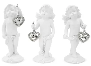 Aniołek Kamienny Stojący z Sercem "Love" Figurki zostały wykonane z poliresingu (kompozyt ceramiczno-alabastrowy) w kolorze białym wraz z dodatkami z dbałością o najmniejsze szczegóły, w tym m. in. niesamowite, hipnotyzujące oczy, oraz dokładnie odwzorowane włosy. Wszystkie postacie zachowana są w odpowiednich proporcjach. Przedstawiają one aniołki stojące w ręku trzymające sznur zakończony srebrnym sercem z napisem "love". Podczas zamawiania proszę o dopisanie w komentarzu, którego z danych aniołków Państwo sobie życzą.