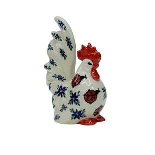 Figurka ceramiczna jest ręcznie malowana w zakładzie ceramiki bolesławieckiej, ANDY Ceramika. Kogut jest świetną ozdobą podczas wyjątkowego okresu świąt Wielkanocnych, doskonale wkomponowuje się jako element dekoracji stołu, parapetu czy ogrodu a nawet koszyczka wielkanocnego. Ceramiczna figurka, która doskonale zaprezentuje się na Twoim stole wśród Twojej ulubionej, ręcznie zdobionej zastawy stołowej z Bolesławca. W ofercie dostępna również figurka kury, która doskonale pasuje do kogucika naszej ręcznej produkcji. Bogate zdobienia podszkliwne ceramiki bolesławieckiej dodają charakteru dekoracji a szereg zróżnicowanych barw i wzorów wyróżnia wyroby ceramiczne spośród innych dekoracji.