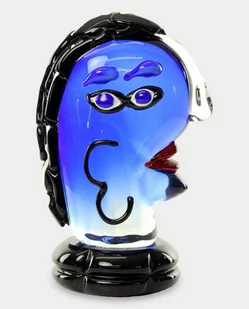 Ekskluzywna figurka ze szkła wykonana ręcznie w stylu weneckiego szkła Murano przedstawiająca kubistyczną męską głowę z niebieską twarzą i czarnym irokezem. Ta szklana rzeźba wykonana jest bardzo precyzyjnie, z dbałością o najdrobniejsze detale. Robi ogromne wrażenie estetyczne i ma ponadczasowy styl. Nadaje się do wielu wnętrz. Figura ta jest w całości zrobiona ręcznie.