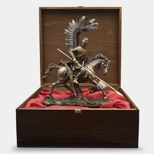 Piękna, realistyczna rzeźba przedstawiająca Husarza Polskiego - legendarnego wojownika na koniu. Zapakowana w eleganckie, drewniane pudełko prezentowe, wyścielone czerwonym aksamitem. Wykonana bardzo precyzyjnie, z dbałością o najdrobniejsze detale. Robi duże wrażenie estetyczne i ma ponadczasowy styl. Nadaje się jako prezent na wiele okazji: