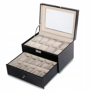 Etui na 20 zegarków Eleganckie i funkcjonalne etui na zegarki. Wykonane z ekoskóry, wyłożone kremowym mięciutkim materiałem, posada szklane okienko oraz metalowy zawias Można w nim przechowywać zarówno zegarki jak i bransoletki, oraz inną biżuterię po wyjęciu poduszek. Etui posiada dwie komory na zegarki, jedną widoczną przez wieczko, drugą natomiast w wysuwanej szufladzie. Górną część można zamknąć na kluczyk, dołączony do pudełka. Wymiary: długość: 28 cm szerokość: