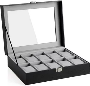 Pudełko, etui, szkatułka na 10 zegarków czarne Eleganckie pudełko to idealne rozwiązanie na ochronę przed kurzem i uszkodzeniami dla Twoich zegarków. Połączenie ciemnoszarego poszycia, błyszczącego metalowego zapięcia sprawia, że przechowywana w pudełku kolekcja zegarków przyciąga wzrok. Specyfikacja techniczna: Wymiary: 25,4 x 7,8 x 20,2cm Wymiary jednej komory: 9,2 x 7,5 x 20cm Materiał: