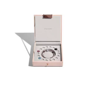 Bransoletki z zawieszkami typu charms zyskały szerokie grono wielbicielek na całym świecie. Ich zaletą jest możliwość personalizacji i dobierania zawieszki do stylizacji lub nastroju. Dlatego marka Stackers zaprojektowała produkt specjalnie z myślą o posiadaczkach bransoletek z charmsami - pudełko na biżuterię Mini z dedykowanymi przegródkami na 18 zawieszek i 1-2 bransoletki. Znajdujące się w pudełku akcesoria są łatwo dostępne i wyeksponowane. Pojemnik na charmsy Mini Stackers jest wykonany w ze skóry ekologicznej w kolorze jasnoróżowym, wewnątrz wyłożony jasnym aksamitem.