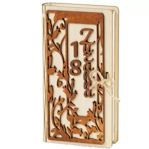 Wieczko to reprezentacyjna część pudełka na pieniądze. Prezentowana na zdjęciu grafika jest specjalnie wycinana i przyklejona mocnym klejem. Ozdobna ramka, cyfra oraz imię solenizanta barwiona jest bejcą. Można wybrać ich wersję kolorystyczną. Pudełko zamykane jest sznurkiem jutowym dołączonym do zestawu.