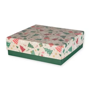 Pudełko Z Przykrywką Nadruk Choinki 285x275x85mm Kolorowe pudełko wieko-dno z nadrukiem świątecznego motywu - wzór w choinki, prezenty, bombki i pierniczki. Idealne do wykorzystania jako opakowanie na prezent dla bliskich, partnerów biznesowych, klientów czy też w ramach podarków świątecznych dla pracownikówWykonane z wytrzymałego materiału z nadrukiem w technice offsetowej. Samo pudełko jest łatwe do złożenia, gdyż nie potrzebna jest do tego taśma klejąca. Wymiary wewnętrzne: *Długość: 285 mm*Szerokość: