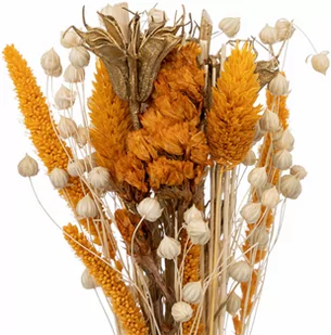 Wazon wypełniony suszonymi kwiatami SUBLIMA – romantyczne wspomnienie ciepłych dniSuszone bukiety: Mnogość pastelowych barw i faktur roślin. Dwa wzory do wyboru: Warianty z pomarańczowymi lub białymi i beżowymi kwiatami. Oryginalna forma wazonu: