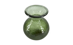 Xielony wazon szklany o wysokości 33 cm. Posiada wąską szyjkę i szeroki kołnierz oraz czarkę o kolistym kształcie. Ścianki naczynia są lekko karbowane, a str...