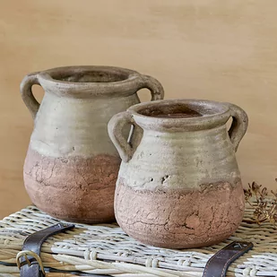 Garncarstwo jest jedną z najstarszych technik rękodzielniczych, jego początki sięgają czasów prehistorycznych. Nasz zestaw również emanuje tajemniczą aurą minionych epok, co czyni go ekskluzywną dekoracją nawet współcześnie. Antyczny, obły kształt z małymi uchwytami i subtelnie nieregularne wykończenie są dla konesera pewną wskazówką, że chodzi o unikatową, wykonywaną ręcznie ceramikę. To założenie zgodne z prawdą, ponieważ tradycyjnie takie naczynia formowano ręcznie z terakoty na kole garncarskim. Patrząc na nasze wazony, nie sposób jednoznacznie stwierdzić, kiedy i gdzie powstały – ze względu na kunsztowne antyczne wykończenie.