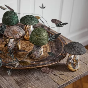 Z unikalnymi, ręcznie wykonanymi wykończeniami – matowym, błyszczącym lub przypominającym krople deszczu. Różne kształty i kolory. Harmonijny zestaw szklanych dekoracji w stylu vintage. Pięć uroczych grzybków dekoracyjnych tworzy wspaniały zestaw, ale samodzielnie prezentują się one także także doskonale. Mają różne struktury – jedna jest piękniejsza od drugiej.