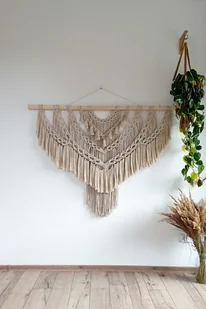 Piękna, bardzo duża, ręcznie wykonana makrama Etiuda w kolorze piaskowym. Strojna makrama zapleciona została ozdobnym splotem na naturalnej gałęzi z czarnego bzu. Uroku dodają jej jeszcze chwosty oraz d ...