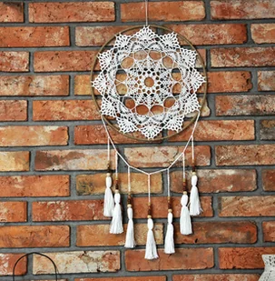 Wyjątkowy łapacz snów w kolorze białym z obręczą oplecioną sznurkiem jutowym. Całość wykonana szydełkiem; ozdobiony chwostami i drewnianymi koralikami; średnica koła 38cm, długość całkowita 76cm. Wszystkie łapacz ...