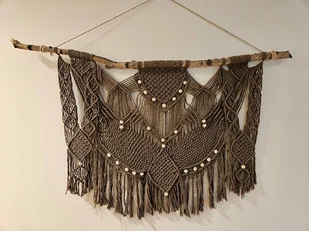 Duża makrama w stylu boho wykonana z brązowego, bawełnianego sznurka, z dodatkiem drewnianych koralików, stanowi idealną ozdobę do wnętrz inspirowanych naturą. Zawieszona na gałęzi z brzozy, nadaje przestrze ...