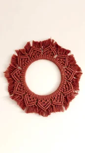 Zaplatana ręcznie makrama o wzorze mandali ozdobi każdą Twoją ścianę i wniesie do Twojego wnętrza dużo dobrej energii. Sznurek 100% bawełna w kolorze terracota. Obręcz drewniana 16 cm a cała szerokość ...
