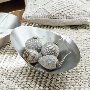 Wyjątkowe wykończenie w antycznym srebrze. Całoroczna ozdoba w stylu vintage. Z delikatnego szkła i z zawieszką z juty. W zestawie znajdują się cztery wzory. Te ozdobne bombki i szyszki wyglądają jak znaleziska z dawnych czasów i doskonale pasują do stylu shabby chic.