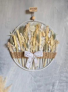 Subtelna dekoracja w stylu boho Metalowa obręcz ozdobiona sznurkiem jutowym, suszonymi kwiatami w odcieniach bieli, szarości i beżu oraz romantyczną koronkową kokardą. Ta ozdoba wprowadzi do wnętrza spokój ...