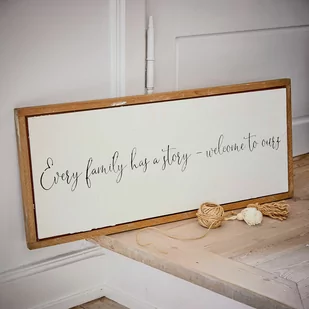Dekoracyjny akcent z oryginalnym powitaniem. Efekt ręcznie pomalowanej tablicy. Idealny wybór do stylu rustykalnego lub vintage. Dzięki tej tablicy dekoracyjnej możesz powitać swoich gości w szczególnie oryginalny sposób. „Każda rodzina ma swoją historię – witaj w naszej”.