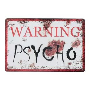 Tabliczka dekoracyjna metalowa WARNING PSYCHO Tabliczka dekoracyjna w kształcie prostokąta. Plakat pokryty farbą o wysokiej klasie ścieralności, dodatkowo posiada on zaokrąglone rogi, dzięki czemu możemy go bezpiecznie użytkować. Produkt posiada celowe efekty postarzania, w postaci namalowanej rdzy, pęknięć i przebarwień. Stabilne przytwierdzenie tabliczki umożliwiają małe otwory umiejscowione w każdym rogu produktu. Produkt przedstawia napis WARNING PSYCHO.