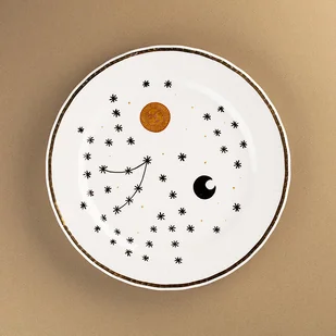 Porcelanowy talerz ręcznie ilustrowany przez Empe artstudio. Talerz z kosmosem stworzony był w duchu zero waste i upcykling - pochodzi z drugiej ręki. Kiedyś przez kogoś używany, później zapomniany, teraz m ...