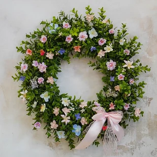 Piękny ręcznie wykonany wianek ze sztucznych kwiatów. Dekoracja na drzwi wejściowe lub dodatek, który pięknie będzie wyglądał na ścianie w salonie lub sypialni. Wianek został wykonany z wysokiej jakości sz ...