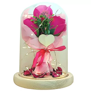 - 3 ciemno różowe główki (mydlane), - Zielona łodyga z różowymi kwiatuszkami, - Różowa wstążka, - Różowy, gruby celofan florystyczny, - Barwione na różowo elementy kwiatu bawełny (na podstawce), - Drewniane serce, - Podstawka z jasnego drewna, - Lampki LED, - Szklany klosz (nie przyklejony do podstawki, można swobodnie rozmieszczać lampki led).