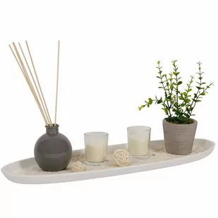Drewniana patera ozdobna z oferty francuskiej marki Atmosphera Créateur d'intérieur to oryginalny stojak na świece i podstawka do palenia kadzideł, zdobione przez praktyczne i niewymagające podlewania sztuczne rośliny oraz subtelne elementy dekoracyjne z naturalnych surowców. Prócz ogromnych walorów wizualnych, jakimi poszczycić może się ten nietypowy świecznik, nie sposób nie docenić jego funkcjonalności. Roztaczając wokół fantastyczną woń pochodzącą ze świec i kadzidełek, tląc się migotliwym, skąpym światłem, ta dekoracja będzie niezastąpioną ozdobą w chwilach zarezerwowanych na odpoczynek, relaks i wyciszenie. Na zestaw składa się naczynie do palenia kadzidła, które może także posłużyć jako stylowy wazon, dwa świeczniki szklane, patera dekoracyjna, 6 kadzideł, 100ml olejku zapachowego, 3 kule dekoracyjne oraz piasek dekoracyjny. Ozdoba doskonale nadaje się do użytku w domu, w łazience czy sypialni, w gabinetach kosmetycznych i spa oraz na zewnątrz, np. w ogrodzie czy na tarasie. Wszędzie tam, gdzie chcemy wyczarować niepowtarzalną i kojącą atmosferę.