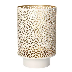 Ażurowy świecznik w biało-złotym kolorze wykonany z metalu. Przepiękny metalowy świecznik o ciekawym zestawieniu kolorystycznym bieli i złota w wyjątkowy wzór przedstawiający gwiazdy. Finezyjne wycięcia przepięknie migoczą w blasku świec, rzucając charakterystyczne cienie. Świecznik zjawisko zaprezentuje się w każdej sypialni czy salonie nadając wnętrzom wyjątkowego klimatu. Skompletuj go z innymi świecznikami tej serii.